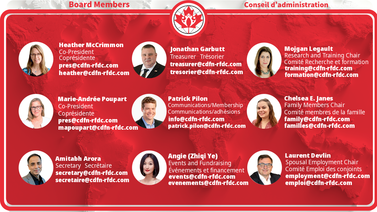 The Canadian Diplomatic Family Network connects family members of Government of Canada representatives at diplomatic missions, and advocates for them to have the best possible experience while preparing for a posting, at post, and when returning to Canada.